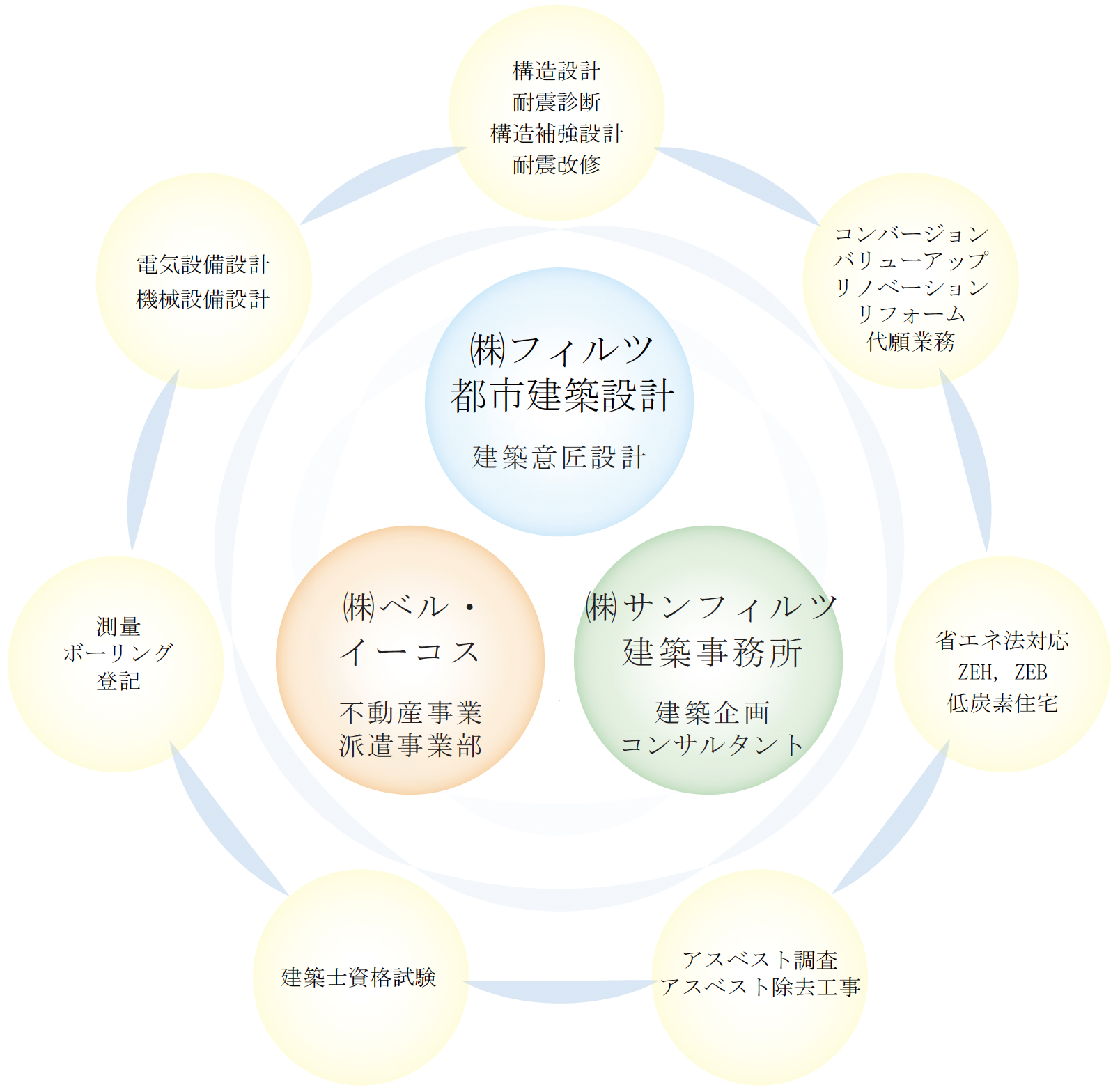 フィルツ都市建築設計の「フィルツ」とは、ギリシャ語の「仲間たち」に由来します。チームワークによって、建築を多角的に築き上げていく総合設計事務所を目指しています。